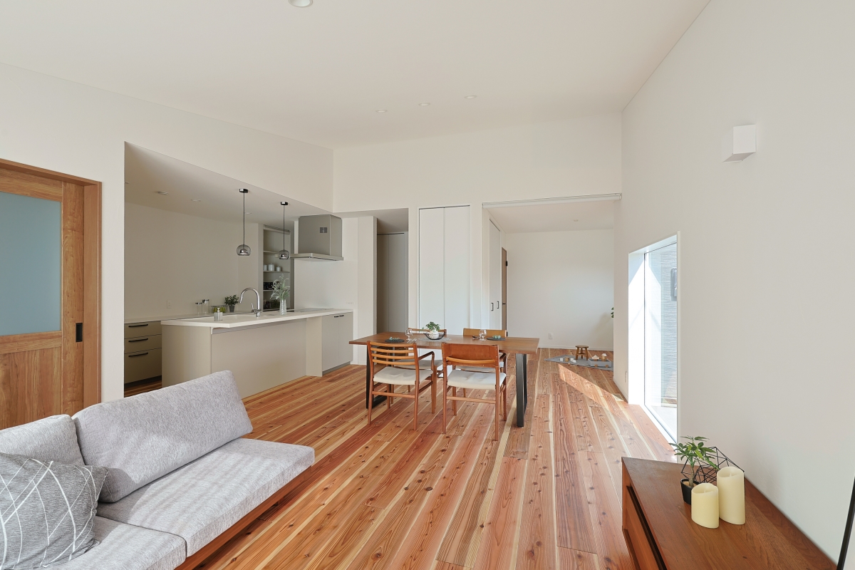 GX補助金の獲得を見据え、南面に太陽光を搭載した省エネ性能の高い平屋住宅です。将来分室可能な洋室を隣接し、約25帖のLDKを実現しました。勾配天井と杉の無垢床が心地よい開放感を演出。玄関から家中を回遊できる動線と、ランドリーとWICを直結した効率的な家事動線も魅力です。収納も約8帖分確保し、性能と暮らしやすさを両立しました。