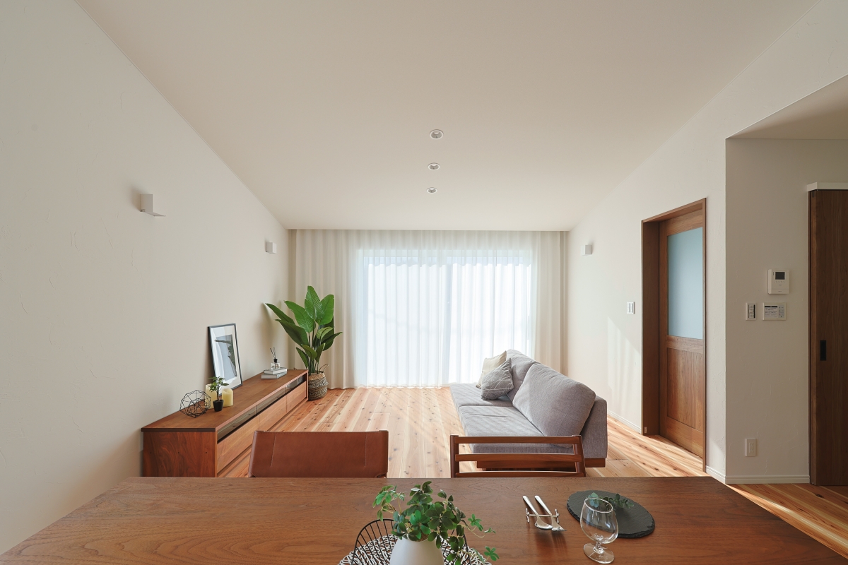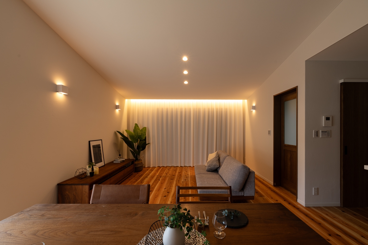 勾配天井が生み出すのびやかな20帖のLDK。昼間はリビングの窓から、レースのカーテン越しにやわらかな光が差し込み、明るく心地よい空間を演出。夜は間接照明がドラマチックに灯ります。