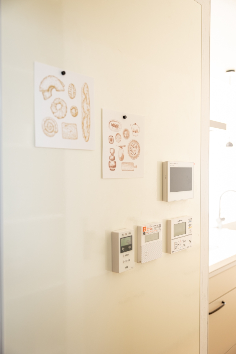 爽やかなホワイトの天板が印象的なキッチン。透明感のあるグレーの照明が空間のアクセントに。パントリーも備え、収納力も◎。玄関と直結する動線は、買い物帰りもスムーズ。