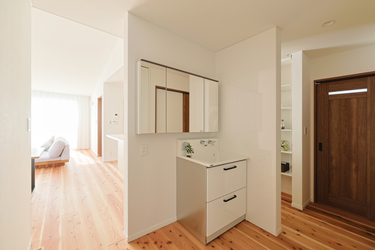 玄関からリビング、キッチン、ウォークインクロークへ直接つながる、使い勝手のよい動線。帰宅後すぐに上着やバックを置ける、買物帰りは、そのままキッチンへ―そんな日常の動きもスムーズに。家中をぐるりと回遊できる間取りは、毎日のストレスを減らします。